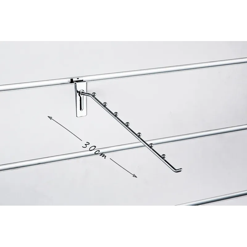 Wieszak pochyły z kulkami o długości 30cm na panel Spacewall. Zawieszka posiada 7 kulek, które idealnie odzielają odzież. Dzięki kulkom istnieje możliwość zawieszenia odzieży według rozmiarów. Wieszak wykonany jest z chromowanego drutu. Towar prezentowany frontem. Dzięki eleganckiemu wyglądowi wieszak idealnie sprawdza się do prezentacji bielizny.