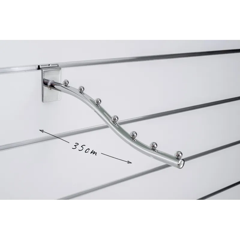 Wieszak fala z kulkami o długości 35cm na panel Spacewall. Zawieszka zawiera 7 kulek ktore idealnie odzielają odzież. Dzięki kulkom istnieje możliwość zawieszenia odzieży według rozmiarów. Wieszak wykonany jest ze stalali pokrytej chromem. Towar prezentowany frontem. Dzięki eleganckiemu wyglądowi wieszak idealnie sprawdza się do prezentacji bielizny.