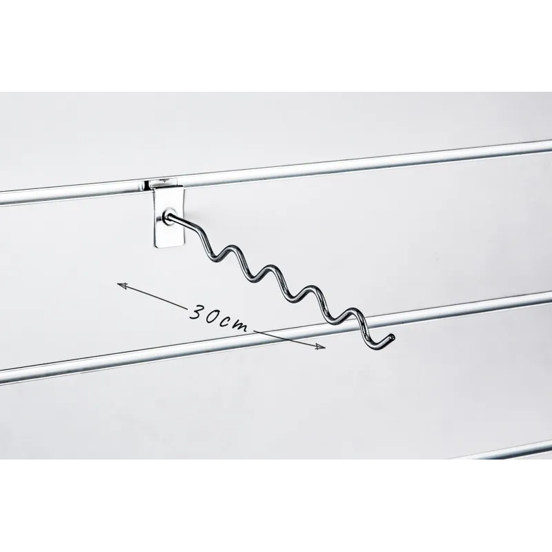 Wieszak pochyły, zygzakowy o długości 30cm, na panel Spacewall. Wieszak wykonany jest z chromowanego drutu fi 8mm. Towar prezentowany frontem. Wieszak przeznaczony głównie do prezentacji odzieży.